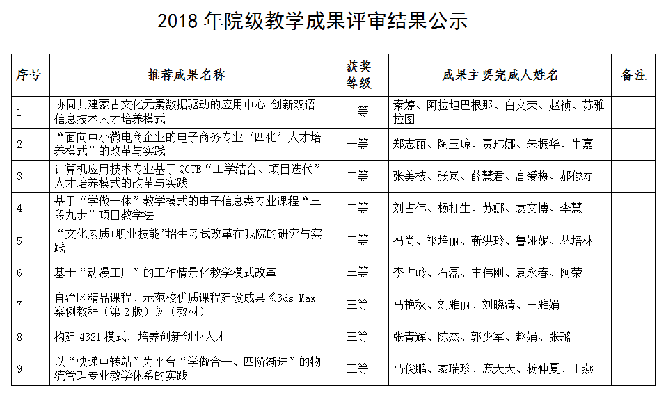 近日,学院2018年教学成果奖揭晓。按照自治区教育厅《关于做好2018年高等教育类自治区级教学成果奖评选工作的通知》(内教高函〔2018〕9号) 和学院《转发自治区教育厅“关于做好2018年高等教育类自治区级教学成果奖评选工作的通知”的通知》(内电信院教务发[2018]4号)精神,经各系部自主申报、校外专家网络评审、现场答辩、校内公示、院长办公会议审定等环节,最终,共有9项成果获得2018年院级教学成果奖,其中一等奖2项,二等奖3项,三等奖4项。