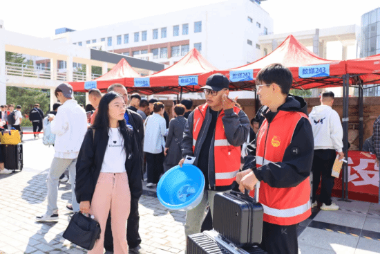 迎新志愿者手持指引牌为新生搬运行李