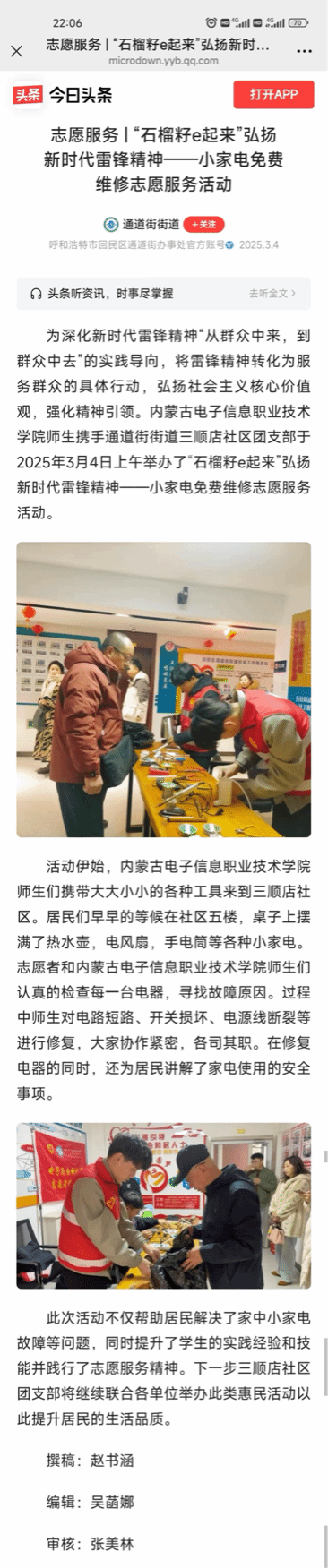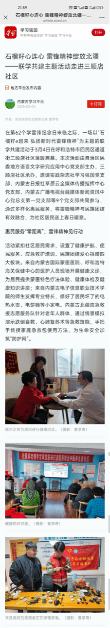 活动结束后,呼和浩特新闻、青橙融媒、学习强国内蒙古学习平台、“通顺街街道”今日头条号媒体和平台刊发了此次志愿服务活动的详细报道。报道对我校电子与自动化系师生在志愿服务中的出色表现给予了高度评价,认为此次活动不仅体现了学校对社会责任的高度认知,更彰显了我校青年学子以专业技能回馈社会的青春风采和责任担当。