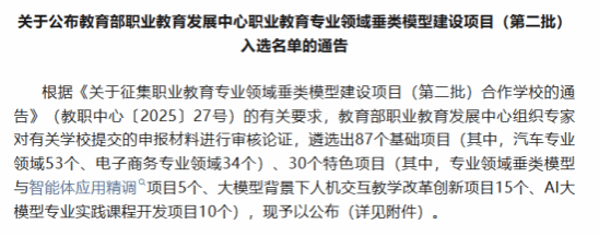 近日,教育部职业教育发展中心发布《关于公布教育部职业教育发展中心职业教育专业领域垂类模型建设项目(第二批)入选名单的通告》(教职中心〔2025〕64号),我校申报的“基于豆包与DeepSeek双模型融合的内蒙古电商特色垂类训练项目”成功入选。