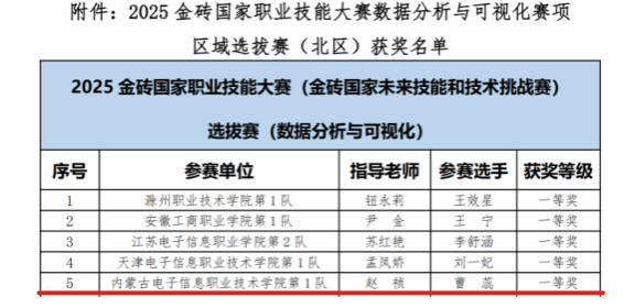 9月25日至26日,由巴西国家工业技能培训服务中心(SENAI)、金砖国家工商理事会联合主办的2025金砖国家职业技能大赛数据分析与可视化赛项区域选拔赛(北区)在重庆工信职业学院举办,吸引全国15个省(自治区、直辖市)的158支队伍同台竞技。我校软件与大数据系曹蕊老师在比赛中荣获一等奖,成功晋级该赛项国际总决赛。