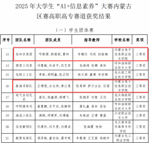 近日,2025年大学生“AI+信息素养”大赛内蒙古区赛圆满落幕。我校学生两支队伍在本次大赛中荣获二等奖1项、三等奖1项,6位老师荣获优秀指导教师奖。
