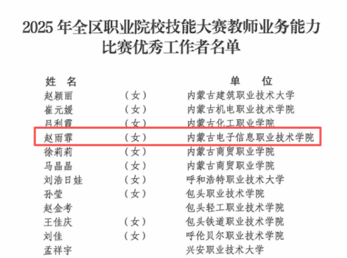 近日,内蒙古自治区教育厅公布2025年全区职业院校技能大赛教学能力比赛获奖名单。我校荣获高职教学能力组二等奖2项、三等奖2项,高职课程思政教学能力组二等奖1项、三等奖3项,1名教师荣获“优秀工作者”称号。
