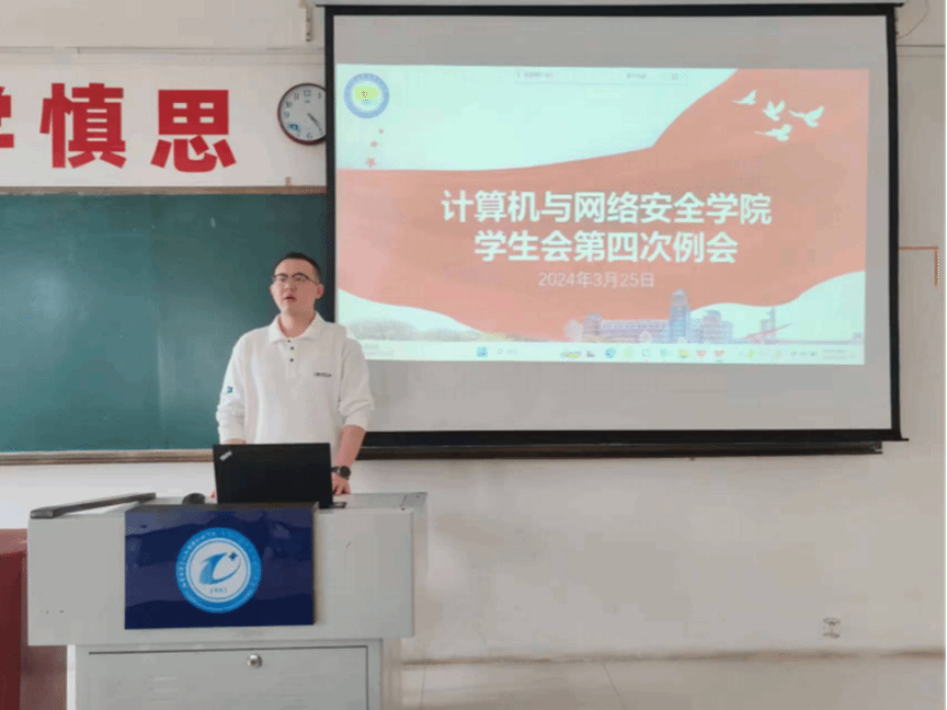 为更好地推进计算机与网络安全学院学生会各部门工作的开展,加强学生干部自治管理,提高学生干部的素质修养及组织协调能力加强凝聚力,计算机与网络安全学院于3月25日晚在F505召开200年春季学期第四次学生会例会。本次例会由学生会主席车昱靖主持,计算机与网络安全学院团总支书记白洋出席会议并发表讲话,学生会全体成员参加。