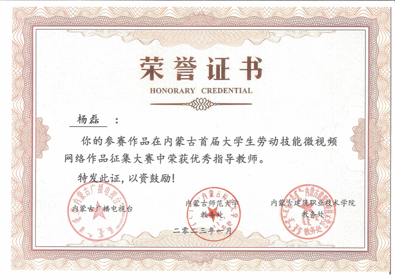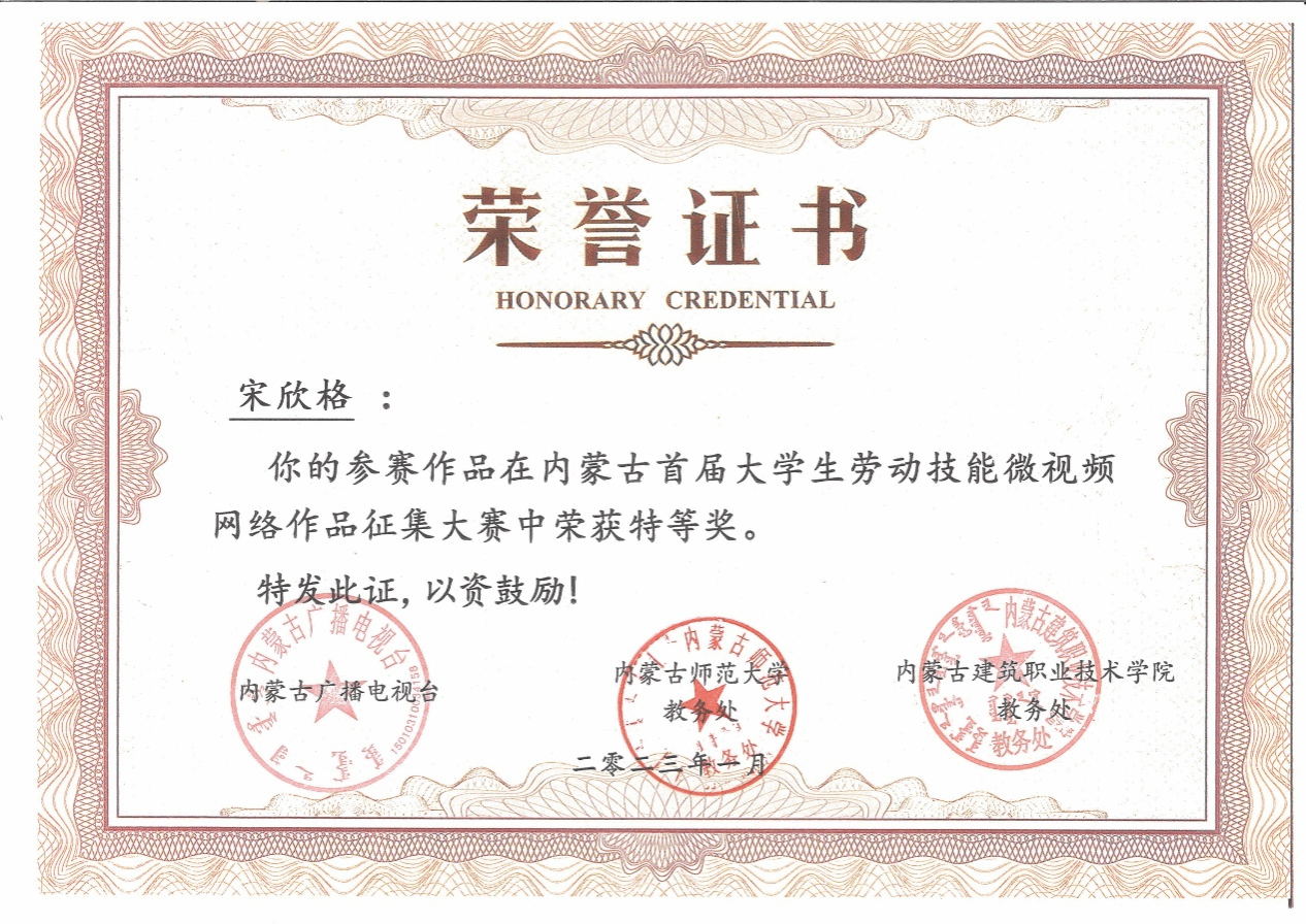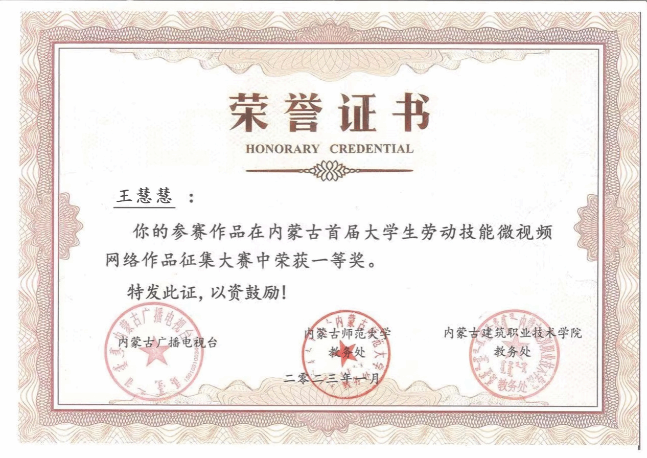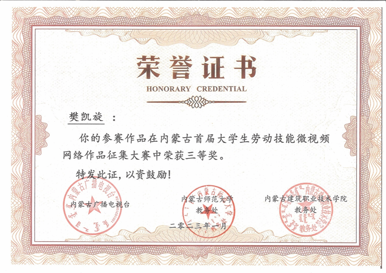在由内蒙古广播电视台经济生活节目制作传播中心、内蒙古师范大学教务处、内蒙古建筑职业技术学院教务处联合举办的“内蒙古首届大学生劳动技能微视频网络作品征集大赛” 中,计算机与网络安全学院高度重视,精心筹划、认真组织,经过激烈的角逐,我院师生荣获多项荣誉,最终2名教师被评为优秀指导教师,学生作品分别或得特等奖1项、一等奖6项、三等奖6项。