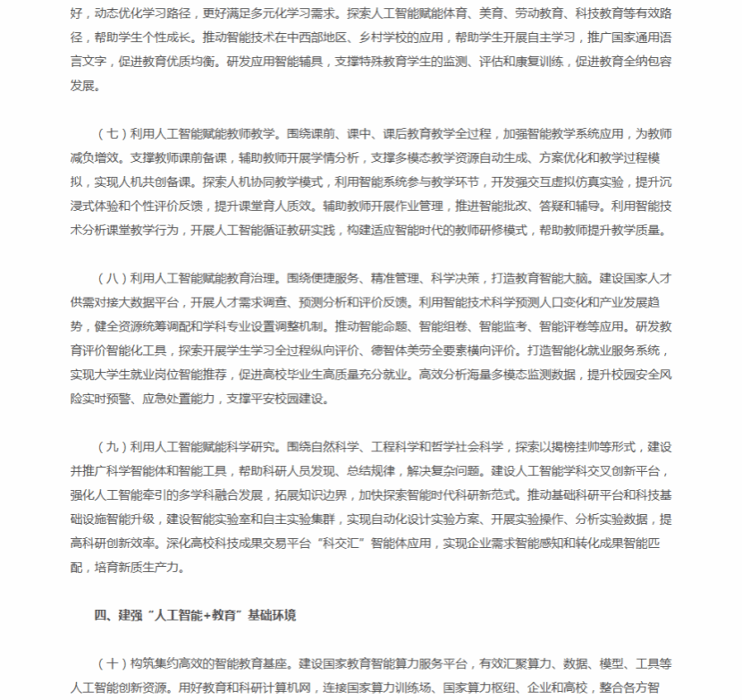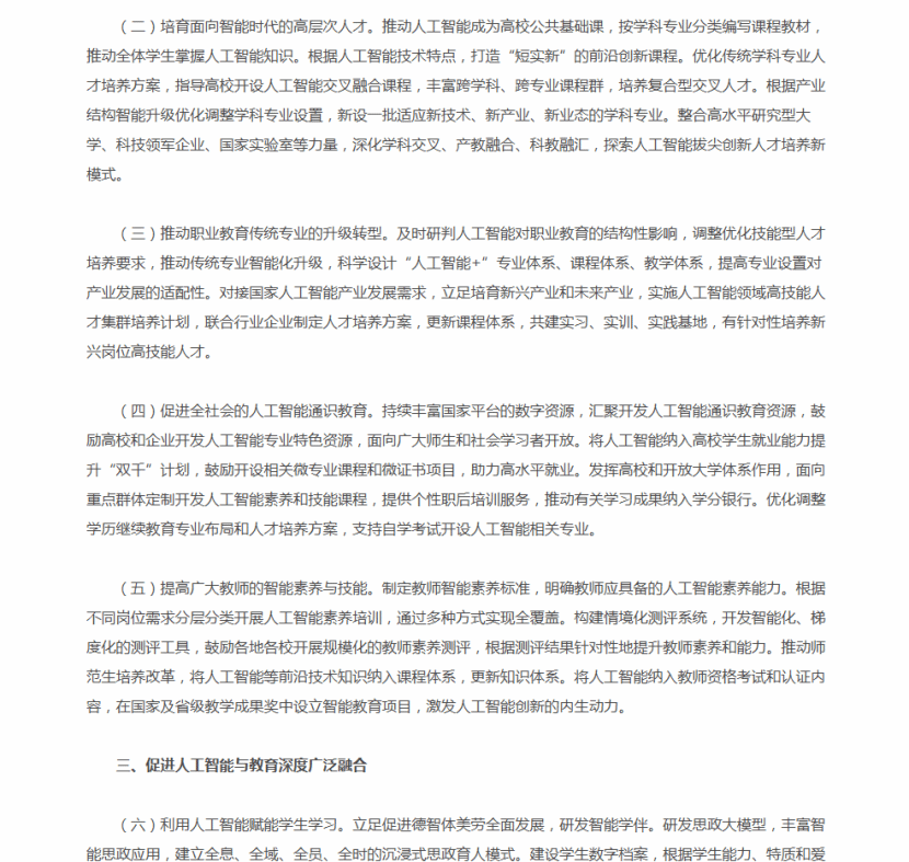 提升人工智能人才培养与全民素养基础教育开齐开好人工智能课程;高等教育将 AI 纳入公共基础课;职业教育推动传统专业智能化升级,培养高技能人才;终身教育扩大优质资源,让所有人都能平等学习人工智能。