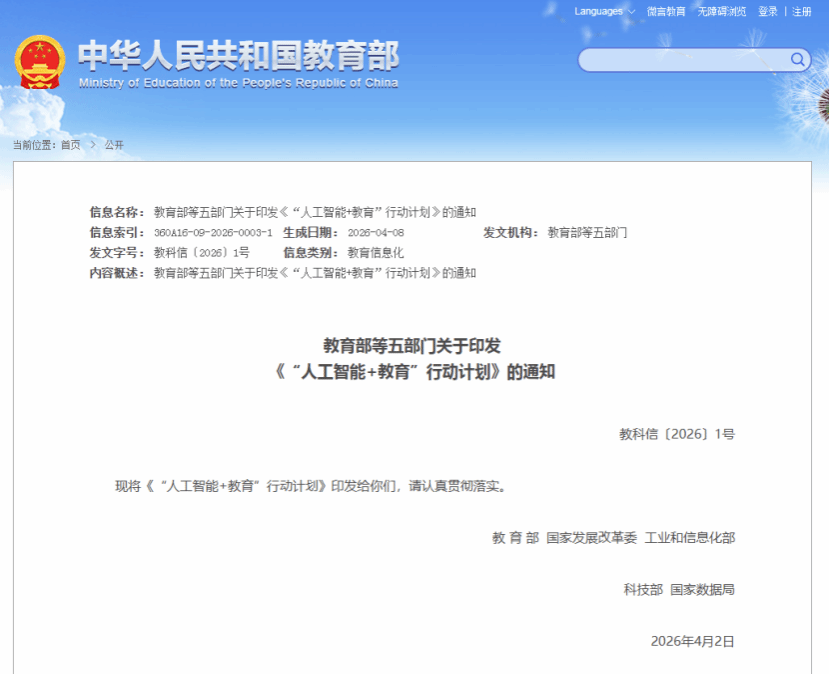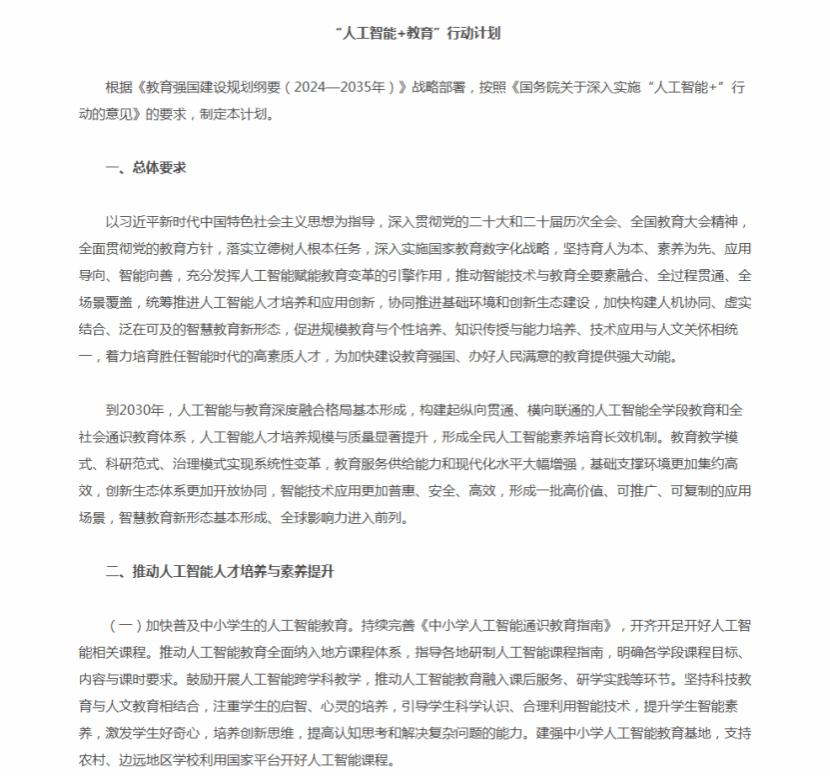 为落实国务院 “人工智能 +” 行动相关部署,教育部、国家发改委、工信部、科技部、国家数据局五部门联合印发了《“人工智能 + 教育” 行动计划》,目的是加快人工智能人才培养与应用创新,搭建配套基础环境,全面构建智能时代的新型教育体系。