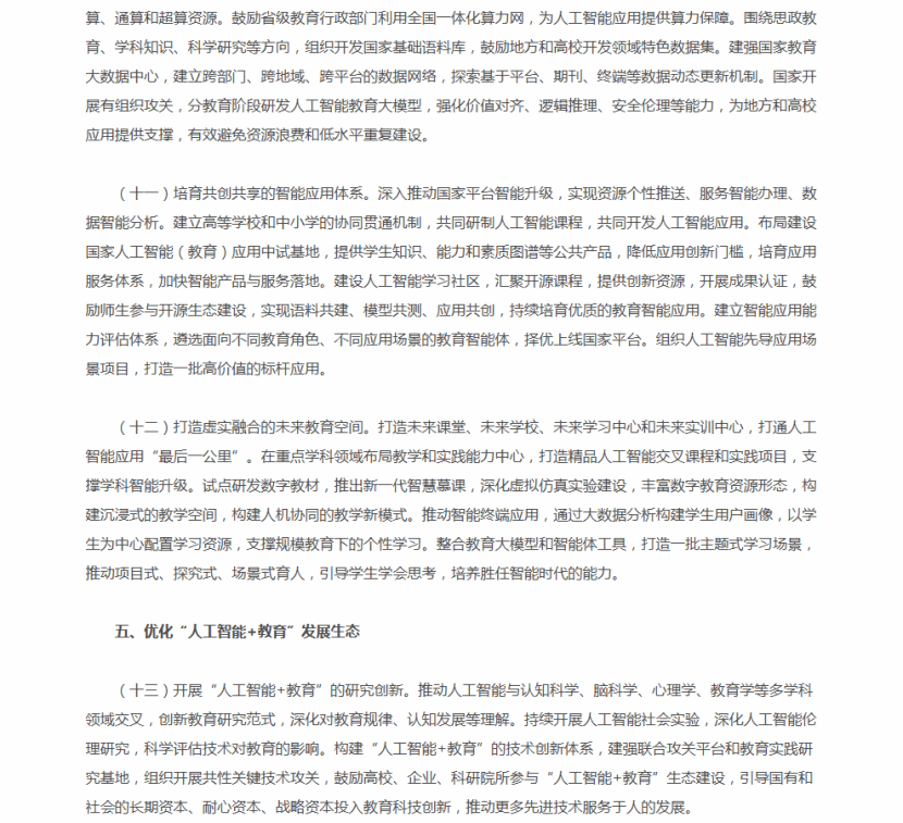 夯实 “人工智能 + 教育” 底层支撑建设国家教育智能算力平台,提供算力、数据、模型等基础服务;培育多元协同的应用生态,建立应用评估机制;打造未来课堂、未来学校、未来学习中心等新型教育空间。