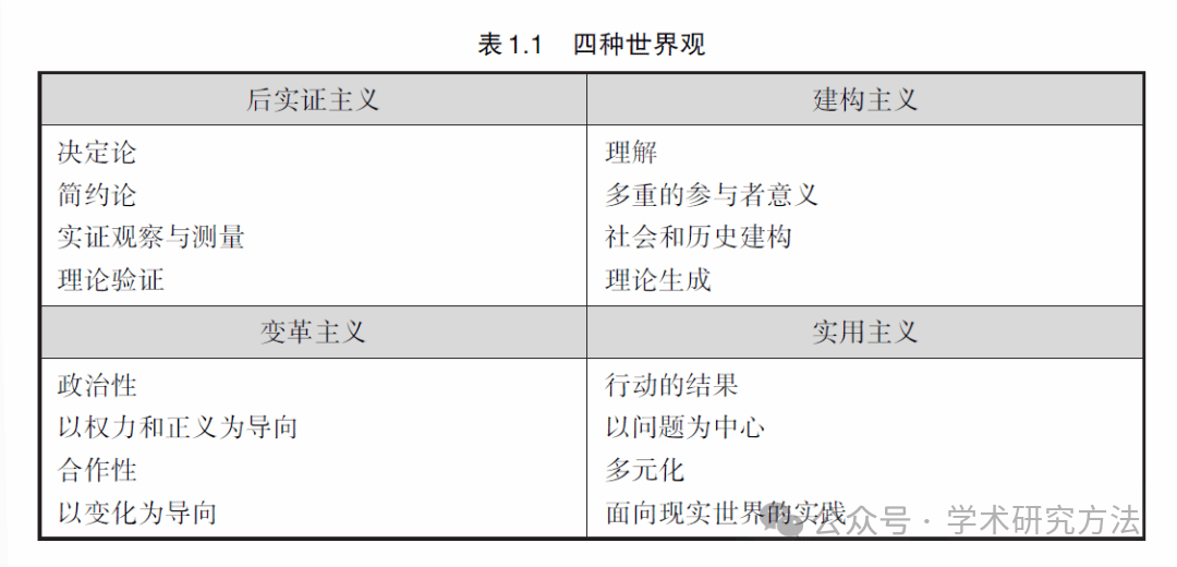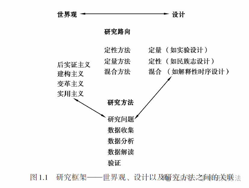 在以上定义中,每个定义都有两个重要组成部分:一是哲学假定,二是不同的的路向方法或程序。广义上的研究路向指的是要撰写的开题报告或研究计划,其将哲学、研究设计以及具体研究方法交织在一起。我们用图1.1所示的框架来解释这三部分之间的交互关系。再重申一下,在设计一项研究时,研究者需要考虑自己在研究中所采用的哲学世界观假定是什么,与该世界观相关的研究设计是什么,要用什么样的具体研究方法或程序来把抽象的研究路向转换为具体的实践操作。尽管世界观在很大程度上是隐含在研究之中的(Slife & Williams,1995),但不可否认,世界观的确影响着研究实践,因此需要把它(们)摆上台面。我们建议,在撰写开题报告或研究计划时,要把隐藏在自己思想深处的世界观明确地表述出来。这种信息有助于研究者将自己选择定量、定性或混合方法的理由说清楚。在表述世界观时,研究者可以专门用一个小节来讨论以下几个方面的问题: 这里的“世界观”的意思是“一组指导研究行动的基本信念”(Guba,1990,p.17)。有人把世界观称为范式(Lincoln,Lynham,&Guba,2011;Mertens,2010),有人称其为认识论和本体论(Crotty,1998),也有人称它为广义研究方法(Neuman,2009)。我们认为,世界观是研究者在开展该研究时所持有的关于世界本质和研究本质的普遍取向。作为个体,研究者的世界观是在自己的学科方向和研究共同体、在自己的导师及老师,以及在自己过去的研究经历的基础上形成的。在这些基础上所产生的学术信念,往往会使研究者个体在自己的研究中持有对定性方法、定量方法或者混合方法的强烈偏好。尽管关于世界观在研究中会如何影响研究者的争论仍然不断,不过这里我们会简明扼要地讨论四种世界观:后实证主义、建构主义、变革主义以及实用主义。在表1.1中,我们给出了每种世界观的主要元素。研究者不仅需选择要用定性方法、定量方法或混合方法开展研究,还要根据这三种路向决定自己的研究类型。研究设计要做的就是在定性方法、定量方法和混合方法这三种路向中选择,进行问题的探究,为研究流程提供具体的方向。也有人把研究设计称为探究策略(Denzin & Lincoln,2011)。这些年来,计算机技术的发展提高了我们分析数据和分析复杂模型的能力,也让研究者能够使用更多的研究设计,因为一些研究者个体也提出了多种开展社会科学研究的流程。我们将在第8章、第9章、第10章的方法部分着重介绍设计的可选择类型,这些都是社会科学中经常被使用的设计。在这里,我们将介绍一些在之后要讨论的设计类型,其也是本书提供的例子所使用的设计类型。表1.2展示了这些设计的概要。