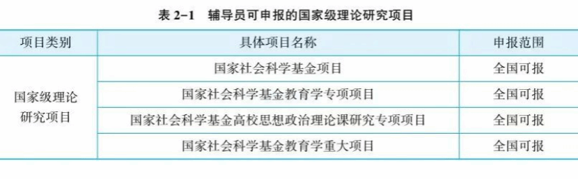 国家级研究项目通常是指由国家级别的科研管理机构或权威学术机构资助的研究项目, 这些项目旨在解决国家重大科技需求、促进学科发展、提高国家竞争力以及推动社会进步, 一般指国家科学技术部、国家自然科学基金委员会、国家社会科学基金委员会等下达的项目。 辅导员可申报的国家级理论研究项目如表 2-1 所示。