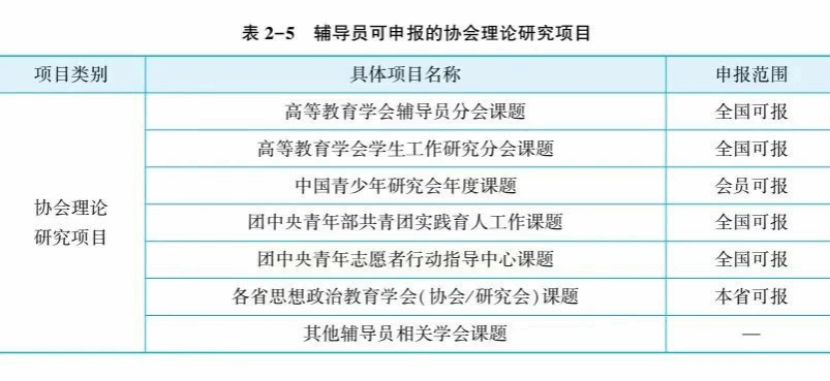 协会理论研究项目通常是由各学会、协会、研究会等组织申报的研究课题。辅导员可申报的协会理论研究项目如表 2-5 所示。