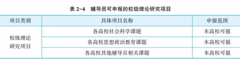 校级理论研究项目是指由高校或学校自主设立并资助的一类研究项目。辅导员可申报的校级理论研究项目如表 2-4 所示。
