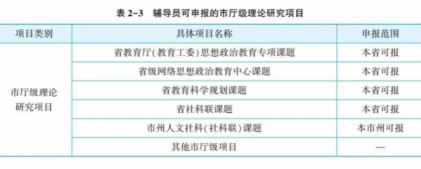 市厅级理论研究项目通常是由市级或厅级单位组织申报的研究课题, 通常针对本辖区内符合条件的申报单位。市厅级理论研究项目包括各种专题研究, 如市社会科学课题等,旨在推动本地区的社会科学和科学技术发展。辅导员可申报的市厅级理论研究项目如表 2-3 所示。