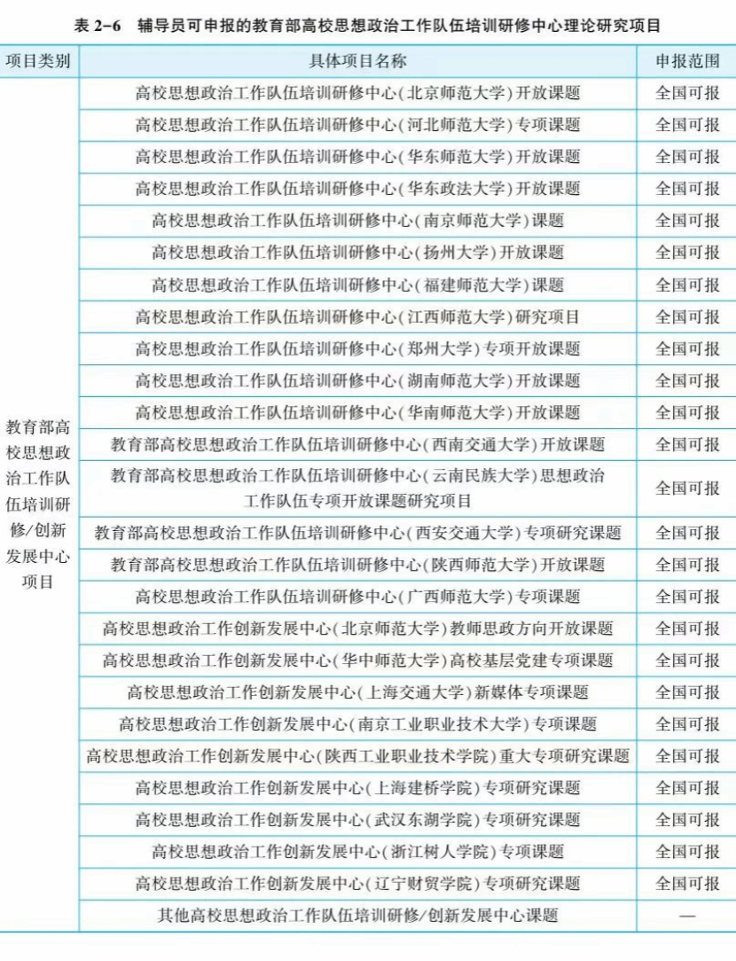 教育部高校思想政治工作队伍培训研修/ 创新发展中心理论研究课题通常是由各个教育部高校思想政治工作队伍培训研修/ 创新发展中心组织申报的研究课题。 辅导员可申报的教育部高校思想政治工作队伍培训研修/ 创新发展中心理论研究项目如表 2-6 所示。