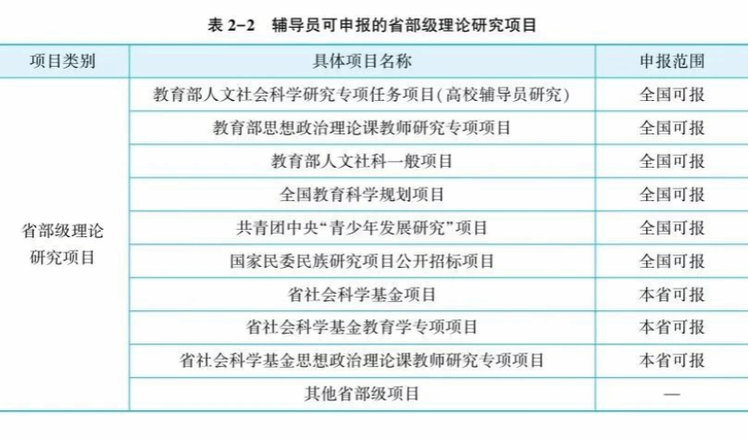省部级项目, 通常指由国家部委、各省级单位资助的研究课题。一般是指省自然科学基金委员会、哲学社会科学基金委员会等下达的项目。辅导员可申报的省部级理论研究项目如表 2-2 所示。