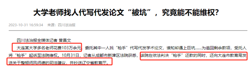 去年10月,《四川法治报》曾报道了大连某大学多名老师花费高达百万的费用找“枪手”代写代发学术论文的新闻。这些老师得知上当后,将“枪手”起诉至法院维权。在“枪手”被判还款的同时,法院还向大连市教育局发送关于整顿师风师德的司法建议,同时抄送辽宁省教育厅。