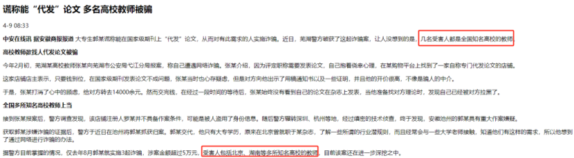 近些年来,一些高校教师找人/机构代发代写论文被骗的新闻,经常见诸网络。