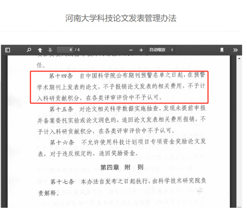 其中河南大学在2022年4月8日发布的《河南大学科技论文发表管理办法》中写道:“自中国科学院公布期刊预警名单之日起,在预警学术期刊上发表的论文,不予报销论文发表的相关费用,不予计入科研贡献积分,在各类评审评价中不予认可。”