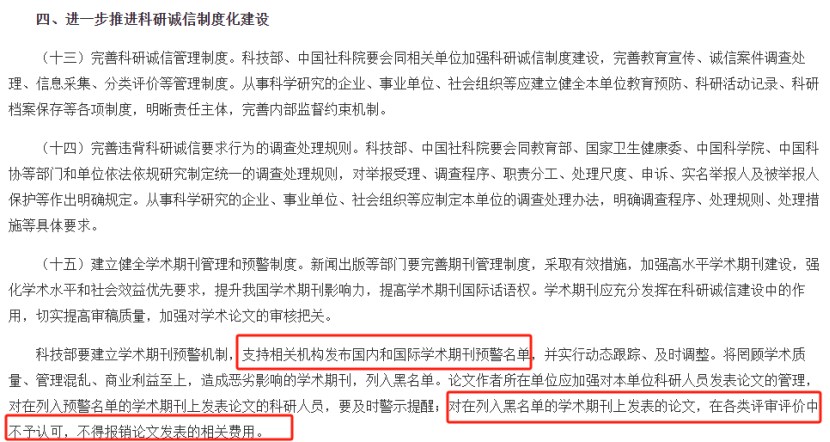 关于学术期刊预警名单,早在2018年5月,国务院办公厅曾发布《关于进一步加强科研诚信建设的若干意见》明确指出“支持相关机构发布国内和国际学术期刊预警名单……,论文作者所在单位应加强对本单位科研人员发表论文的管理,对在列入预警名单的学术期刊上发表论文的科研人员,要及时警示提醒;对在列入黑名单的学术期刊上发表的论文,在各类评审评价中不予认可,不得报销论文发表的相关费用”。
