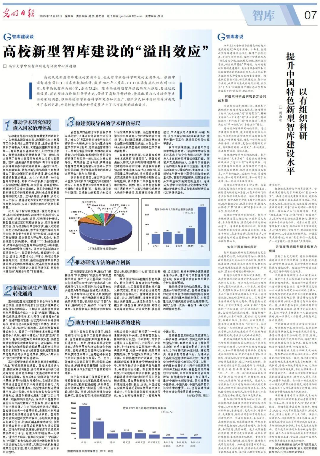 今年是《关于加强中国特色新型智库建设的意见》印发十周年。十年来,我国新型智库建设快速推进,取得了重要进展,发挥了重要作用,但部分智库仍存在“研究方向分散、组织模式松散、团队组建零散、研究成果弱散”等问题。智库的有组织科研是建制化、成体系服务国家和区域战略需求的重要组织形式,也是完善智库组织形式和管理方式的重要途径。构建供需紧密对接、研究快速反应、集体协作攻关、成果系统集成的运行机制,应作为“十五五”时期提升中国特色新型智库建设水平的“新基建”加以重视。