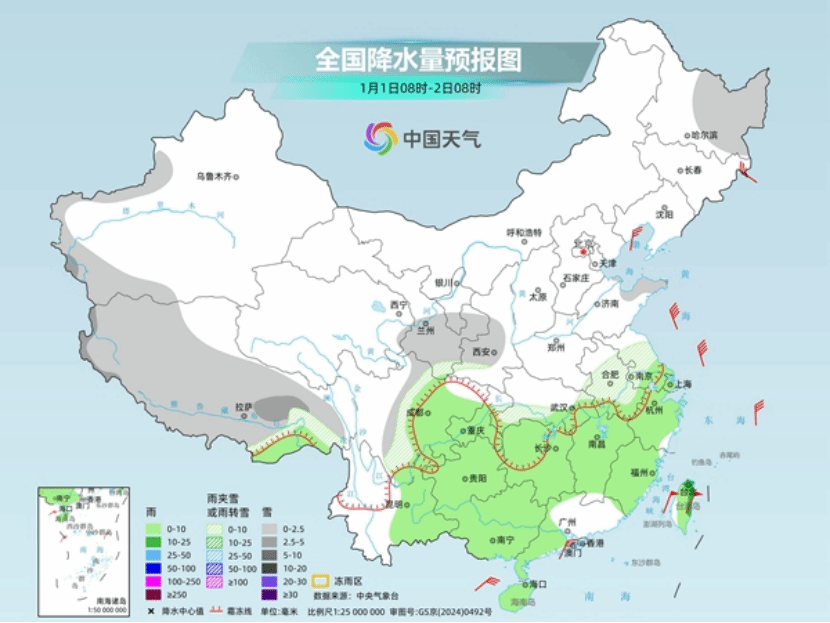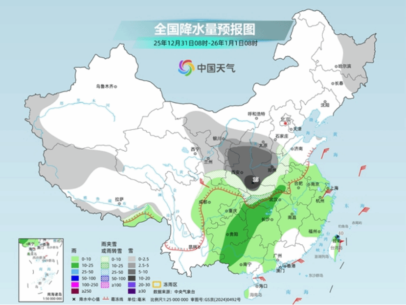 除了降温,冷空气还将带来大范围雨雪天气。随着冷空气南下与暖湿气流交汇,今天至2026年1月1日,中东部将现大范围雨雪,陕西中南部、山西南部、河南西部、湖北西部部分高海拔地区有大雪或暴雪,最强降雪时段为2025年12月31日至2026年1月1日早晨。
