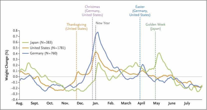 如上图所示,三国居民体重在全年范围内增重速度最大的月份是隆冬的1-2月。为什么会这样呢?研究人员给出了一个很好玩的结论,那就是节日问题。