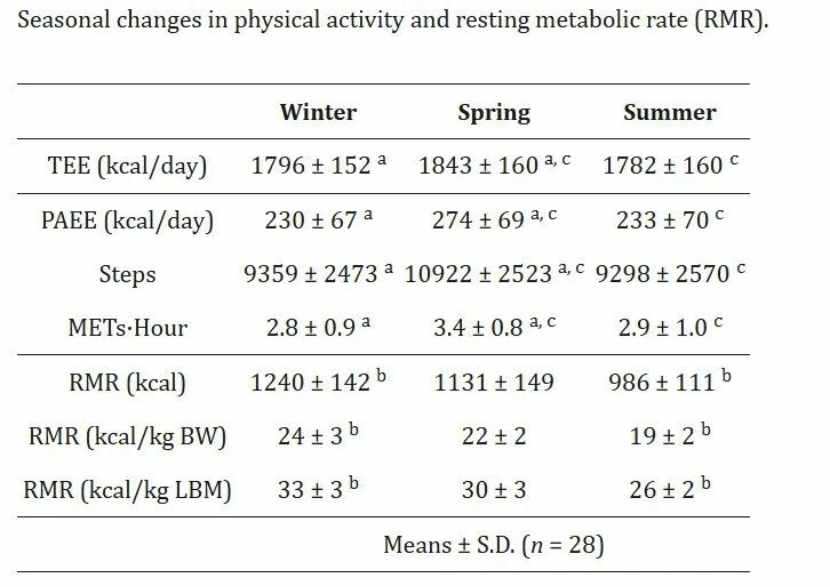 但是与之对应的是,春季的消耗量却增加了,如下表所示,一年中,春季的总能量消耗(TEE)是一年中最高的,而这种能量背后是运动量的增加,比如通过运动计算的能量消耗在春季最高(PAEE)。