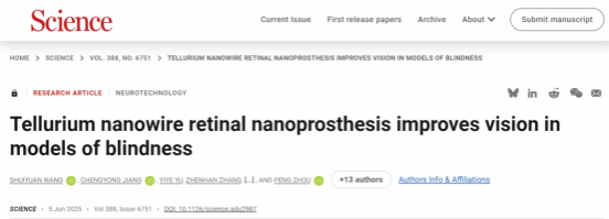 6月6日,上海科研团队联合在《科学》(Science)期刊发表研究长文,合作开发出全球首款覆盖可见光至近红外二区(470–1550nm)的超宽光谱视觉假体,不仅让因视网膜退化而失明的小鼠重获可见光视觉,更赋予其感知红外图案、识别红外信号的能力。集成芯片与系统全国重点实验室、复旦大学集成电路与微纳电子创新学院周鹏、王水源,脑功能与脑疾病全国重点实验室、复旦大学脑科学研究院张嘉漪,红外科学与技术全国重点实验室、中国科学院上海技术物理研究所胡伟达为论文共同通讯作者。王水源和博士生姜承勇、余羿叶,南洋理工大学博士后张振汉,北京邮电大学副教授屈贺如歌为论文共同第一作者。