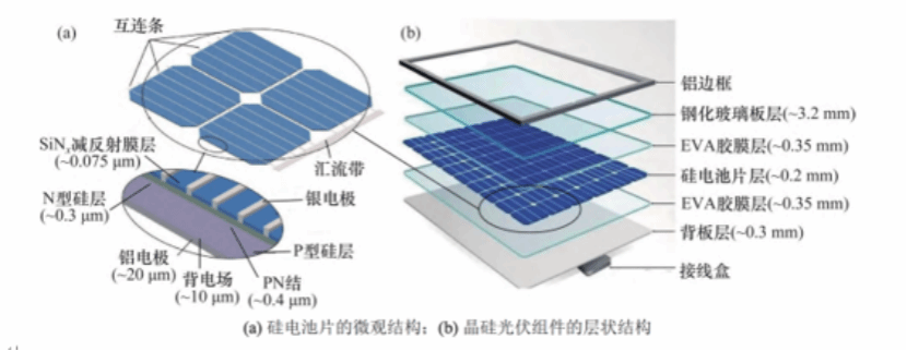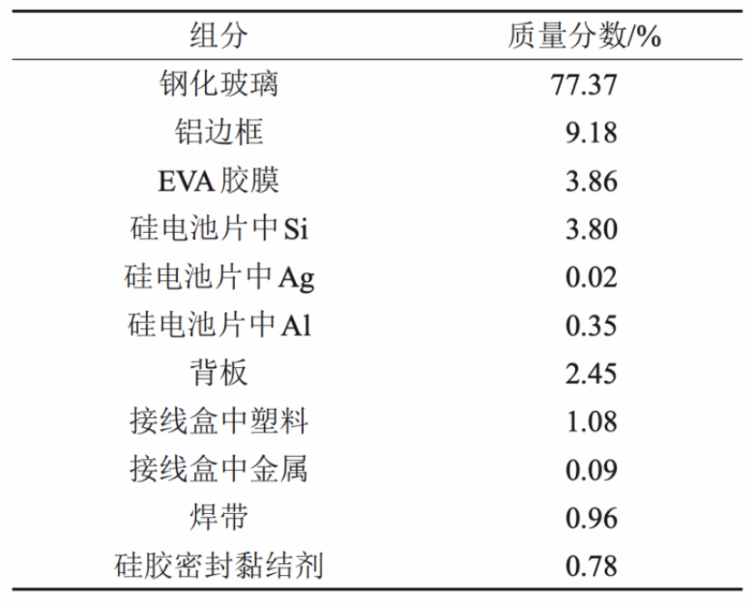 属性特点:单晶硅光伏组件和多晶硅光伏组件的基本结构大致相同。光伏组件的层压结构从上到下依次为钢化玻璃板层、EVA 胶膜层、硅电池片层、EVA 胶膜层和背板层。晶硅电池片用互连条、汇流带串联并一起密封在EVA胶膜中。层压结构四周嵌入铝边框中,嵌槽缝隙中填充有硅胶,并将二者黏结在一起,接线盒粘贴在背板底部。该组件中,钢化玻璃的质量分数最大,其次为铝边框,硅(Si)的质量分数较小,约为3.80%,银(Ag)的质量分数最小,仅有0.02%。