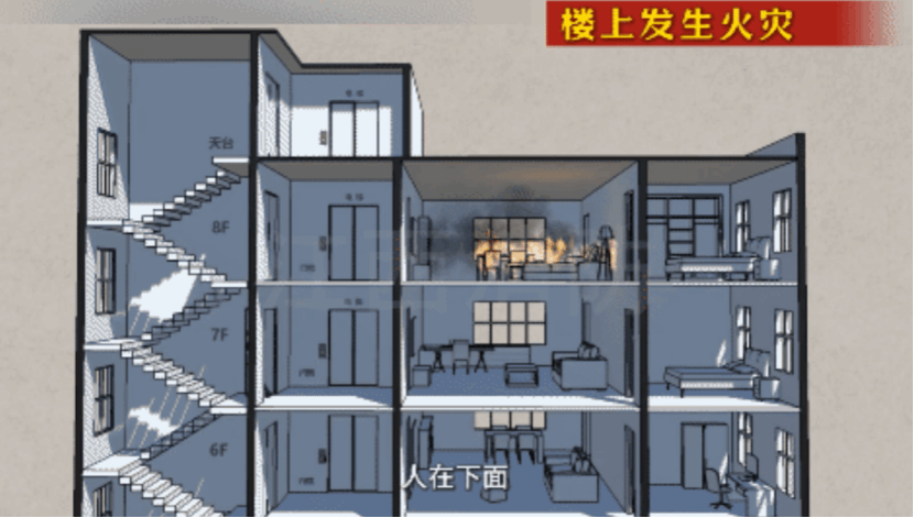 楼上发生火灾:这种情况危险最小,火在上面,人在下面,火势和浓烟被楼板阻隔。只要从楼梯下楼即可,下楼时不要乘坐电梯。