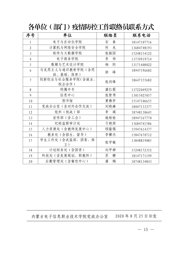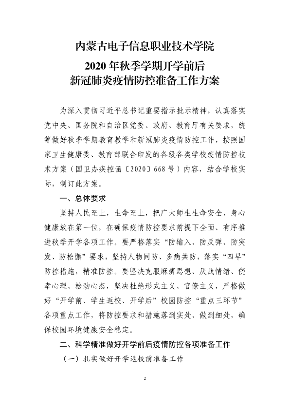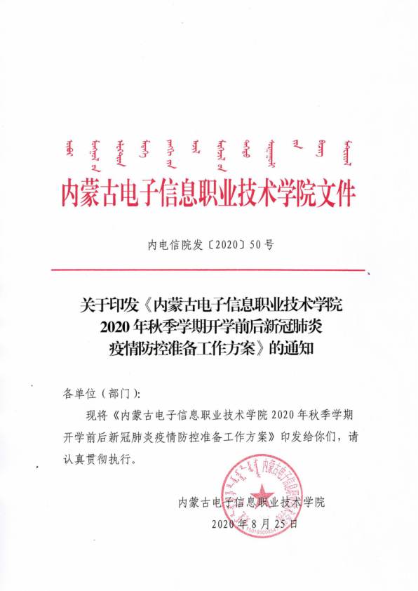 关于印发《内蒙古电子信息职业技术学院2020年秋季学期开学前后新冠肺炎疫情防控准备工作方案》的通知(内电信院发〔2020〕50号)