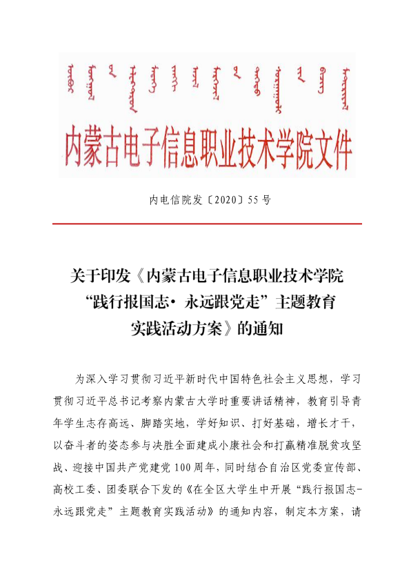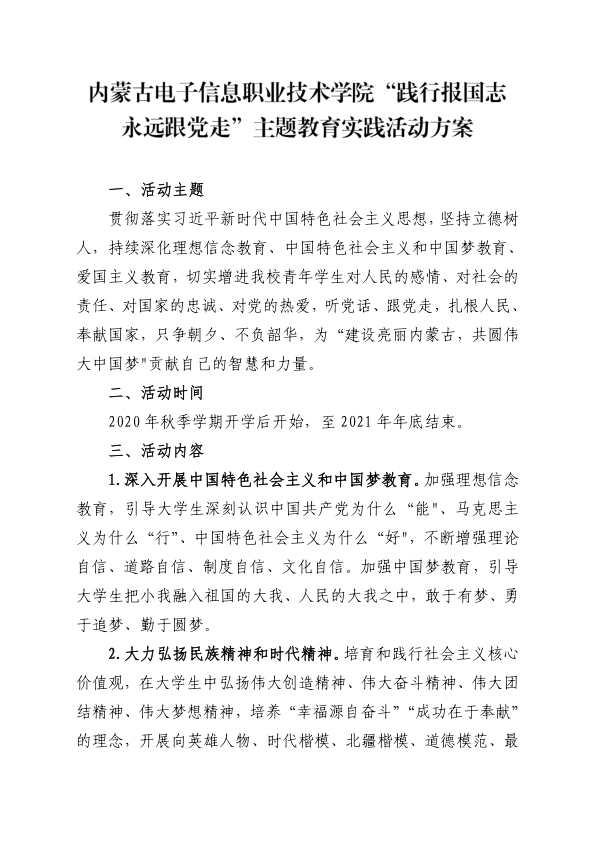 关于印发《内蒙古电子信息职业技术学院 “践行报国志•永远跟党走”主题教育 实践活动方案》的通知