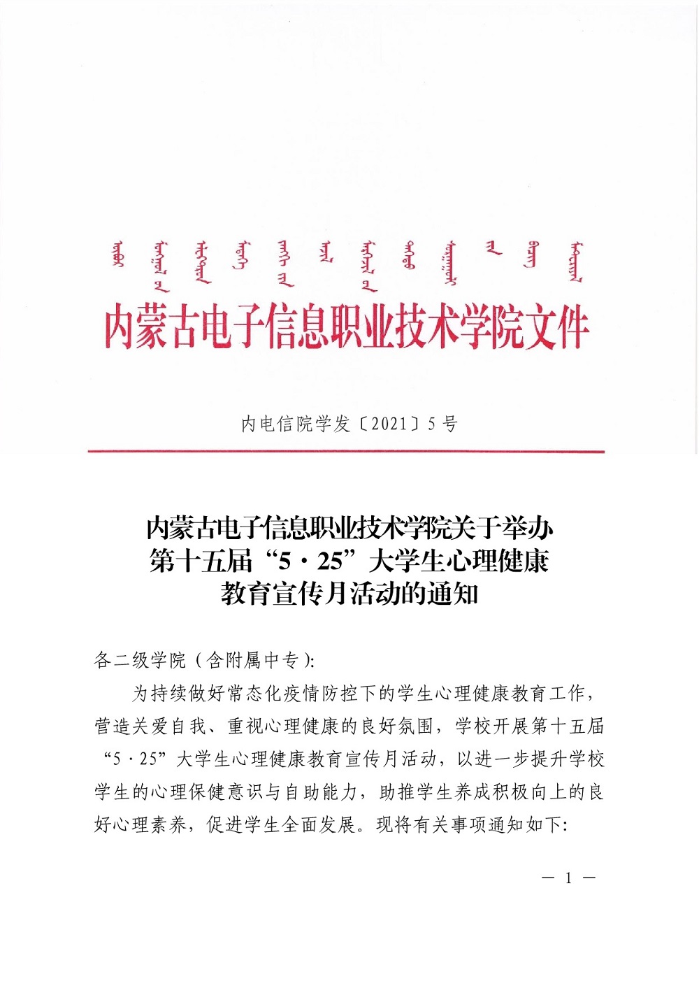内蒙古电子信息职业技术学院关于举办第十五届“5·25”大学生心理健康教育宣传月活动的通知