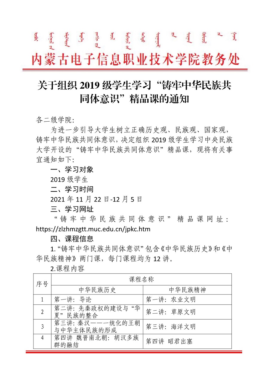 关于组织2019级学生学习“铸牢中华民族共同体意识”精品课的通知