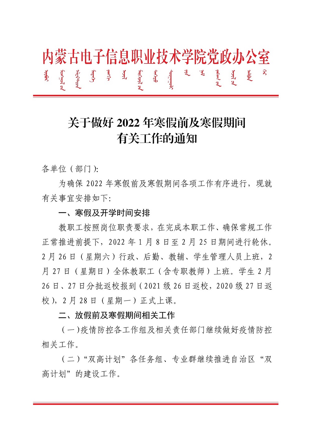 关于做好2022年寒假前及寒假期间有关工作的通知