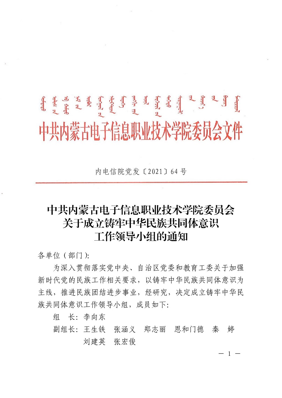 中共内蒙古电子信息职业技术学院委员会关于成立铸牢中华民族共同体意识工作领导小组的通知