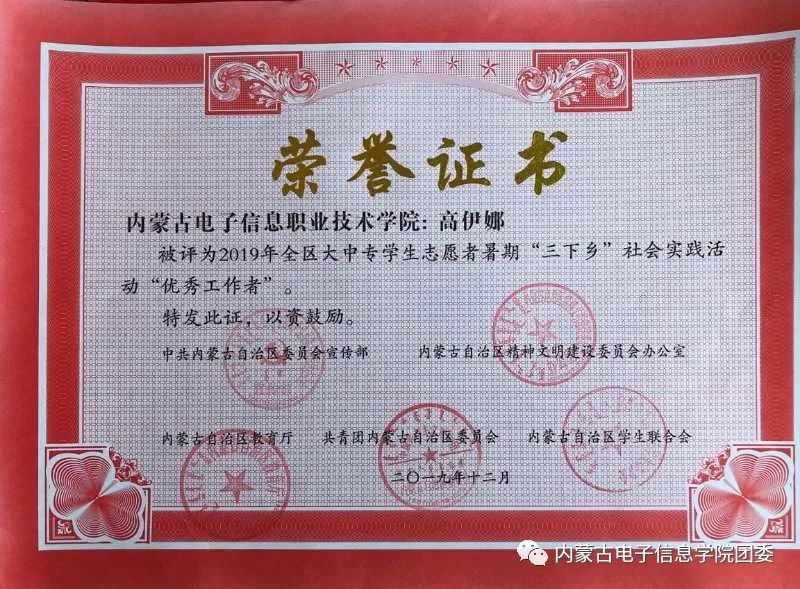 近期,自治区党委宣传部、文明办、教育厅、团委、学联决定联合下发了《关于表彰2019年全区大中专学生志愿者暑期“三下乡”社会实践先进集体和优秀个人的决定》,其中,我校喜获“优秀组织奖”;校团委直属团队“‘习’得新思想筑梦亮北疆”新思想宣讲团荣获“优秀志愿者服务队”荣誉称号;高伊娜、苏雅、谢喆老师分获“优秀工作者”“优秀指导教师”荣誉称号;李新、张景琛、吴彤、乌迪、董志鑫、张泽鹏、李嘉轩、陶佳鑫等8名同学均获得“优秀志愿者服务队员”荣誉称号。