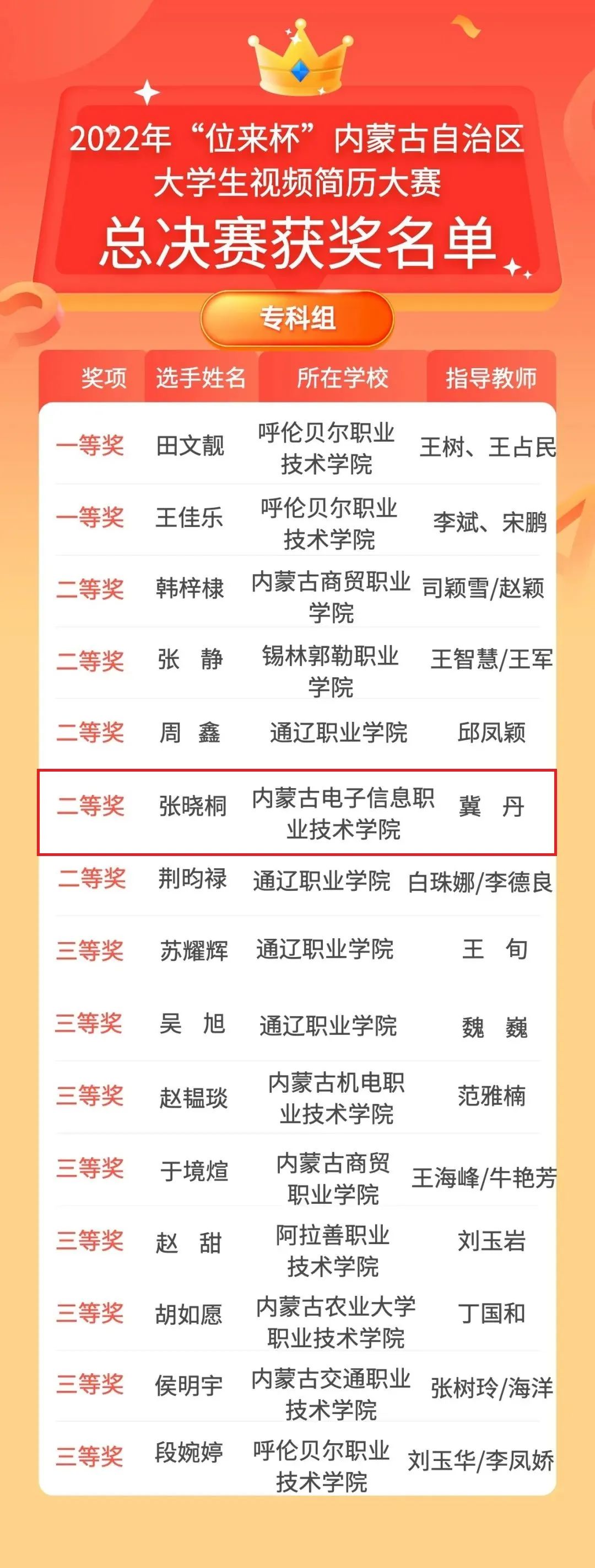 近日,内蒙古自治区高校学生就业创业服务中心公布2022年“位来杯”内蒙古自治区大学生视频简历大赛总决赛获奖名单,我校电子商务学院冀丹老师指导、张晓桐同学创作的作品荣获专科组二等奖,成为全区5个专科组二等奖获得者之一。