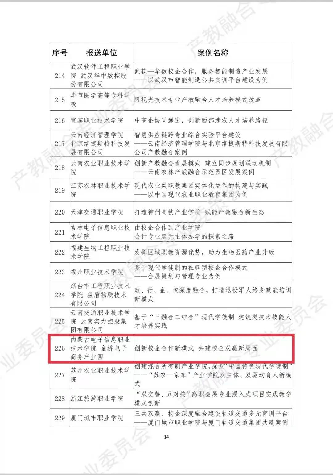 日前,中国教育发展战略学会产教融合专业委员会公布2021年产教融合校企合作典型案例名单,内蒙古电子信息职业技术学院与金桥电子商务产业园报送的题为《创新校企合作新模式、共建校企双赢新局面》的案例榜上有名,成为全国485个典型案例之一。
