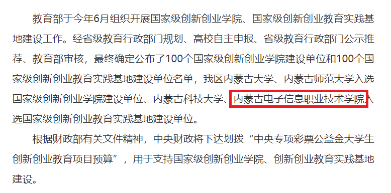 据报道,教育部于2022年6月组织开展了国家级创新创业学院、国家级创新创业教育实践基地建设工作,除我校外,内蒙古自治区另有内蒙古大学、内蒙古师范大学入选国家级创新创业学院建设单位,内蒙古科技大学入选国家级创新创业教育实践基地建设单位。根据财政部有关文件精神,中央财政将下达划拨“中央专项彩票公益金大学生创新创业教育项目预算”,用于支持国家级创新创业学院、创新创业教育实践基地建设。