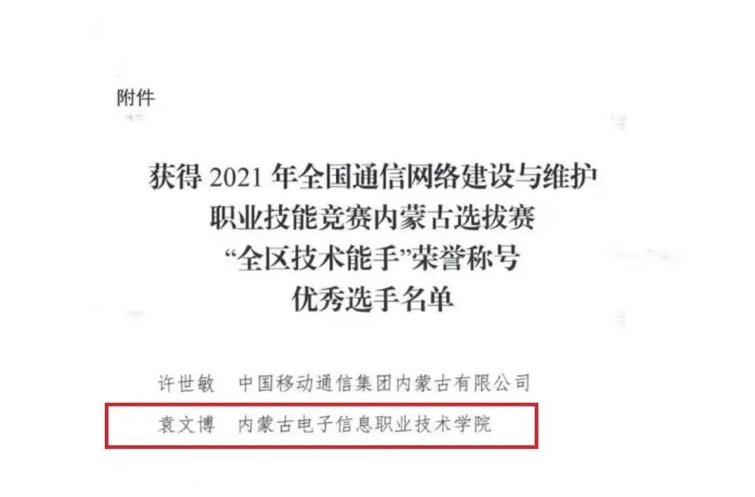 日前,自治区人力资源和社会保障厅印发《关于授予2021年全国通信网络建设与维护职业技能竞赛内蒙古选拔赛优秀选手全区技术能手的决定》,内蒙古电子信息职业技术学院电子与自动化学院袁文博老师荣获2021年“全区技术能手”荣誉称号,成为自治区2名在此次表彰中获此殊荣的选手之一。