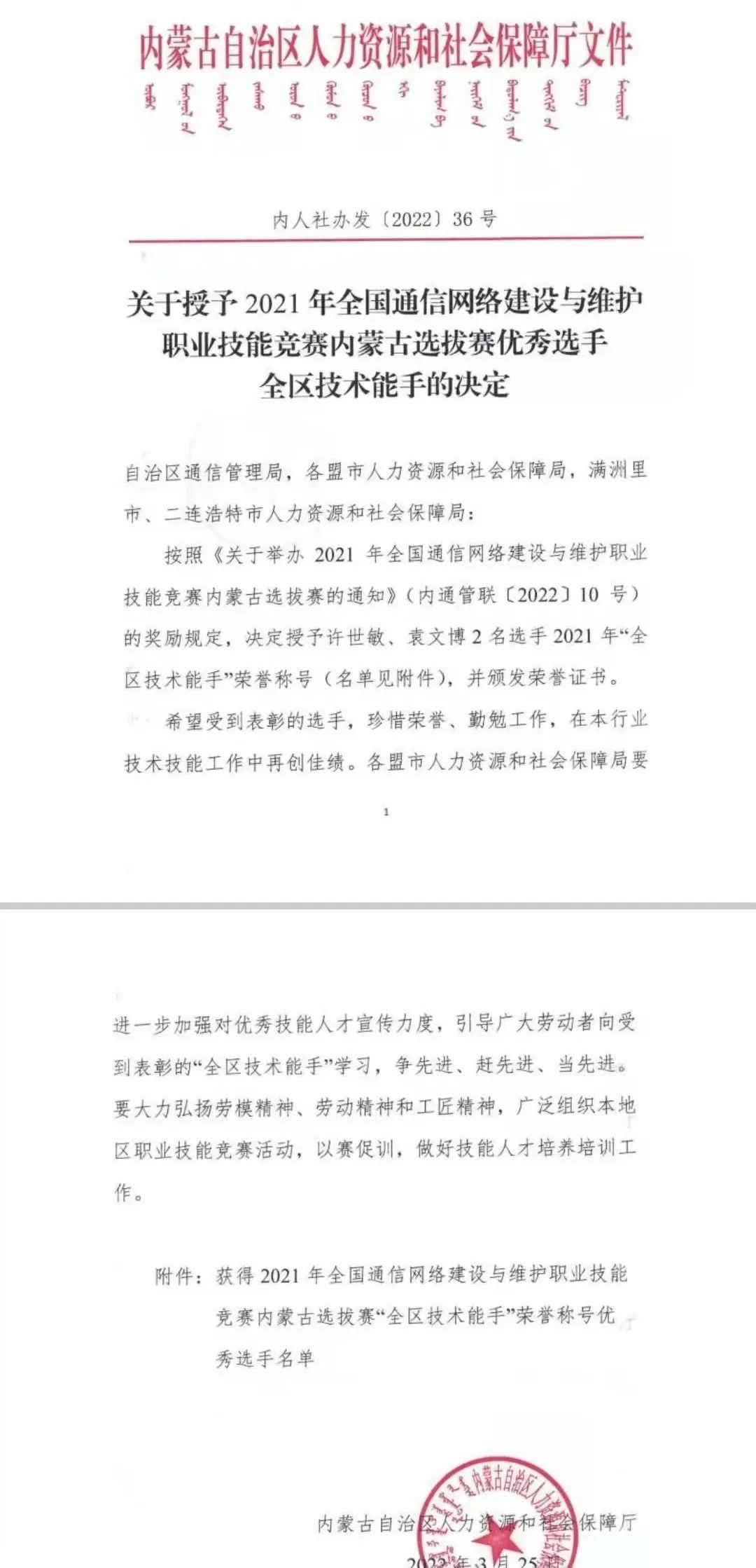 据介绍,按照《关于举办2021年全国通信网络建设与维护职业技能竞赛内蒙古选拔赛的通知》(内通管联〔2022〕10号)的奖励规定,自治区人力资源和社会保障厅开展此次表彰工作,旨在大力弘扬劳模精神、劳动精神和工匠精神,动员各盟市广泛组织本地区职业技能竞赛活动,以赛促训,做好技能人才培养培训工作。