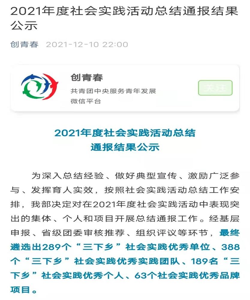 为深入总结经验、做好典型宣传、激励广泛参与、发挥育人实效,按照社会实践活动总结工作安排,近日,共青团中央青年发展部对在2021年度社会实践活动中表现突出的集体、个人和项目开展总结通报工作。