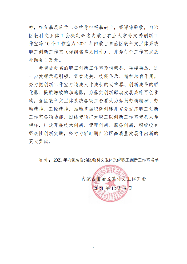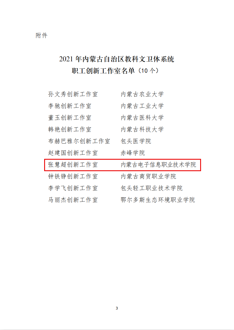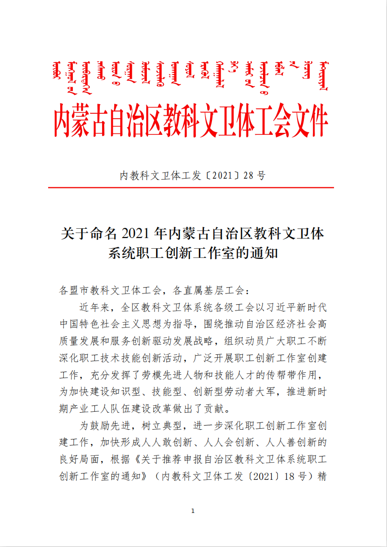 近日,自治区教科文卫体工会印发《关于命名2021年内蒙古自治区教科文卫体系统职工创新工作室的通知》,在各基层单位工会推荐申报基础上,经评审验收,我校张慧超创新工作室成为10个2021年内蒙古自治区教科文卫体系统职工创新工作室之一,并获得补助金1万元。