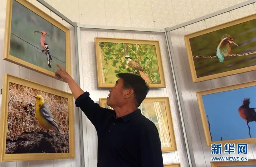 6月7日,廷·巴特尔介绍他在草场拍摄的野生鸟类照片。新华社记者 恩浩 摄