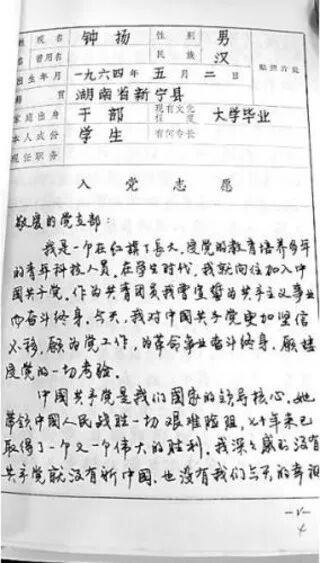 1990年4月26日,26岁的钟扬在入党志愿书中郑重写道:“我是一个在红旗下长大、受党教育培养多年的青年科技工作者。在学生时代,我就向往加入中国共产党。今天,我对中国共产党更加坚定不移。我愿为党工作,为革命事业奋斗终身。”
