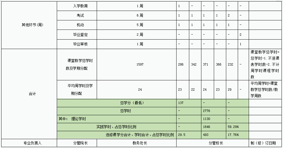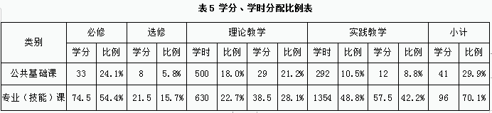 理论课程即A类 和B类(含课内实验/实践)16学时计1学分。其中,体育30学时计1学分,形势与政策40学时计1学分。实践课程即C类,按每周计1学分(30学时),包括入学教育和军训、专业综合实训(毕业设计)、跟岗实习等。(学分、学时分配比例如表5所示)