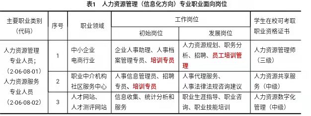 人力资源管理(信息化方向)专业职业面向的具体岗位如表1所示。