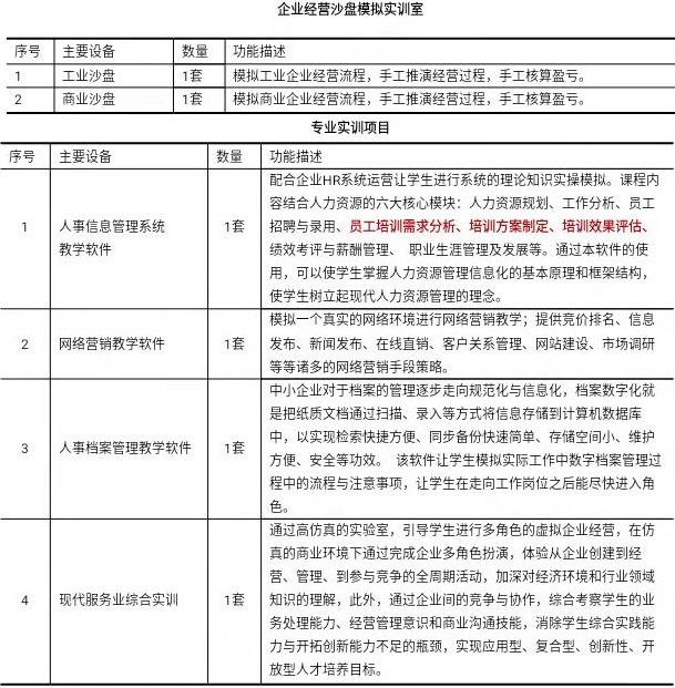 因此,课程教学应在专业实训室中或在实际的工作环境中进行,使学生能手脑并用、学做合一。人力资源管理(信息化方向)专业具备的实训项目有:人力资源管理信息系统实训项目、企业经营沙盘模拟实训项目、档案管理与数字信息化实训室、现代服务业综合实训室等多个专业实训项目。