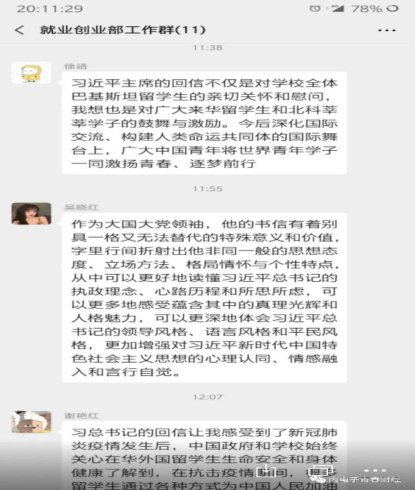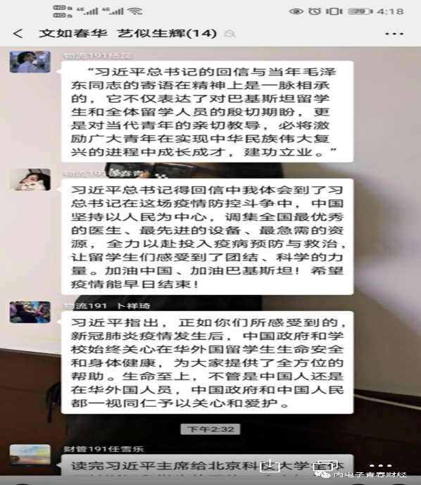 为深刻学习和领会“习近平总书记在北京科技大学全体巴基斯坦留学生的回信”丰富内涵和进一步贯彻落实回信精神实质,6月9日电子商务学院团总支组织各团支部线上召开 “学习习近平总书记北京科技大学全体巴基斯坦留学生的回信”团日活动。各团支部通过微信群、钉钉等APP展开热烈讨论,激励了全体青年把回信精神落实到思想和行动上,充分发挥青年的积极作用。